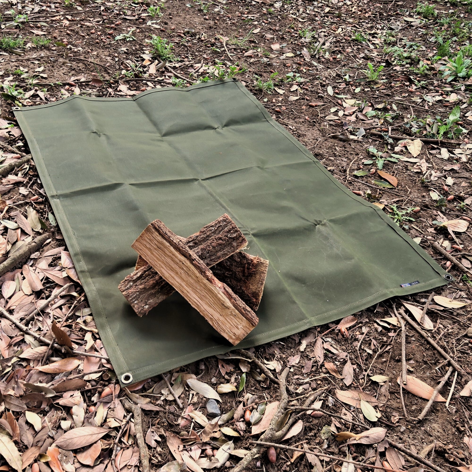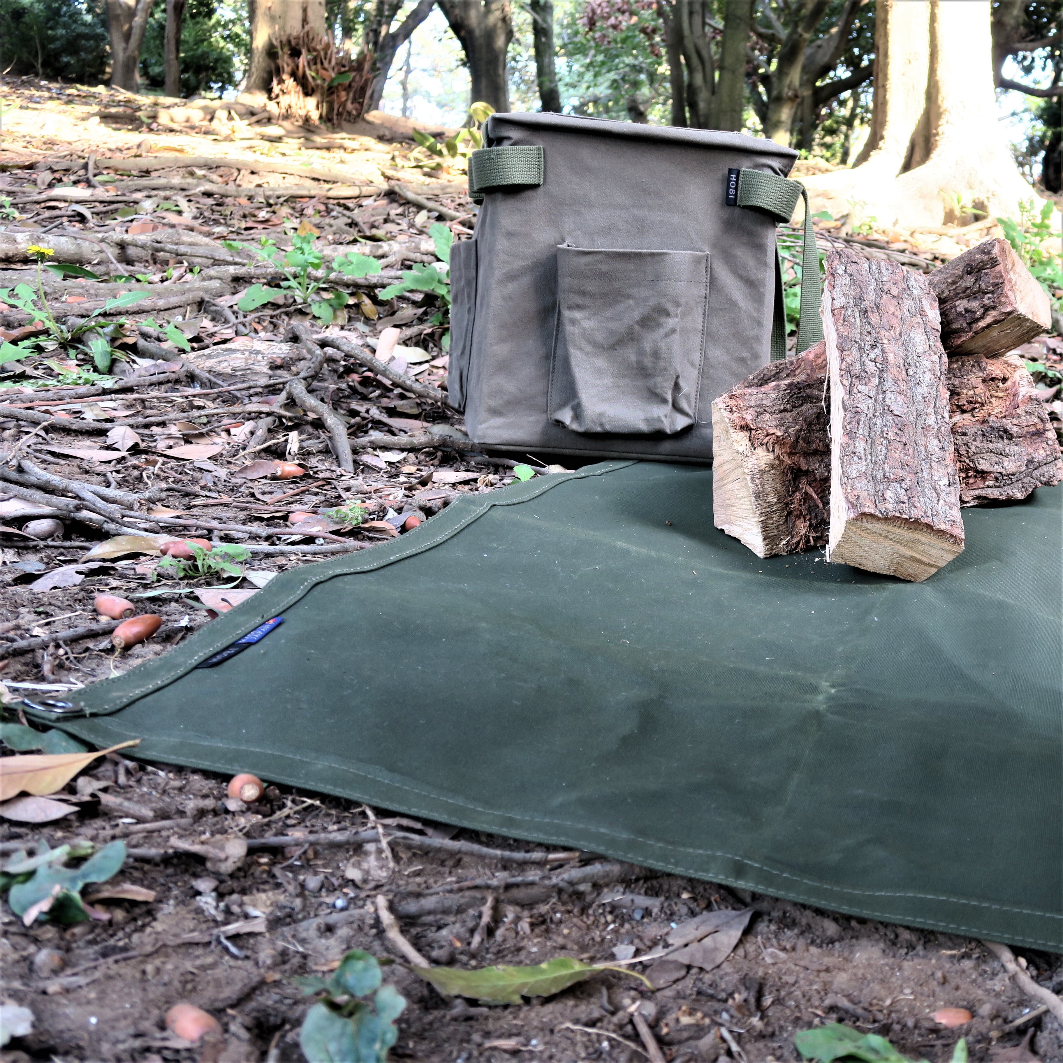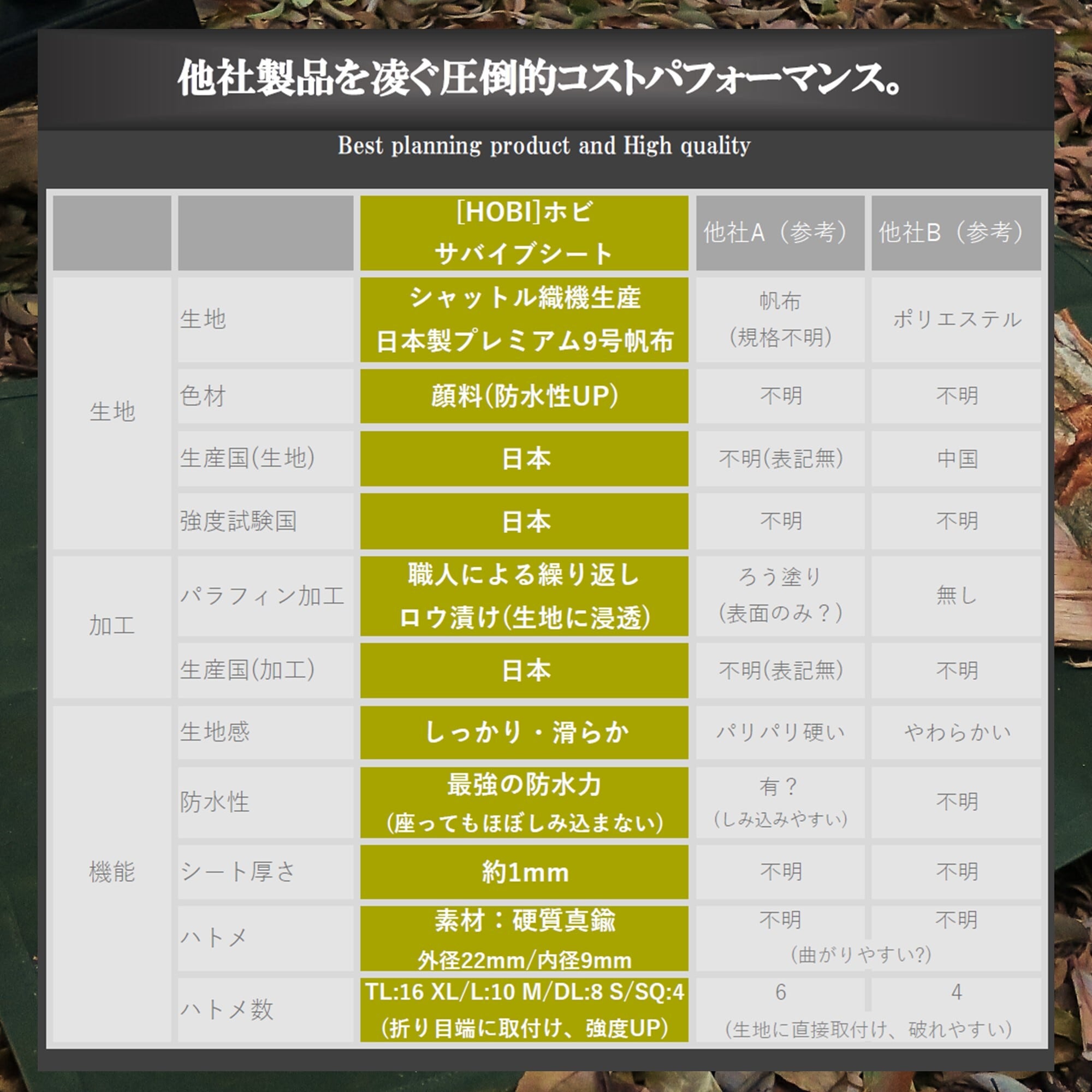 ⛺特長①日本製【MADE IN JAPAN】●国内で生産された上質9号プレミアム帆布と特殊パラフィン加工されたサバイブシートは、高い品質を保っております。江戸時代より使用されている頑丈で分厚くしっかりした帆布は軍用テント、トラックシート、救急タンカ、柔道着等に使われ、非常に破けにくい綿100%の環境にやさしい素材です。厚手なので20kgの薪を包んで持ち上げてもびくともしない無骨な重厚感があります。特殊なパラフィン(ロウ漬け)加工により高い防水性を実現し、使い込む程にビンテージ風な雰囲気を表現します。野外、キャンプ、ソロでの様々なシーン、ロケーションに活躍するシートです。