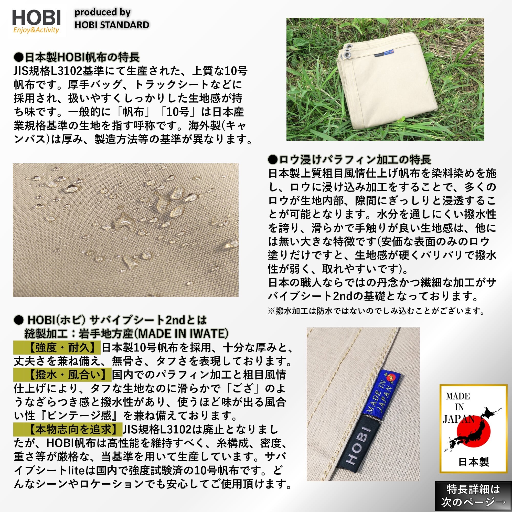⛺上質な日本製10号帆布(粗目風情仕上げ)をパラフィン加工、製品仕上げまで一貫して日本で企画開発、生産された『無骨』で『タフ』な陣幕系マルチシートがこの【サバイブシート2nd】です。『LITE&TOUGH』をコンセプトにレジャー、アウトドア、キャンプ、など幅広い用途に耐え得る様、頑丈さ、撥水性に特化した工夫を施しております。9号帆布(HOBIサバイブシート)と比較すると薄手、撥水度が劣りますが耐久度は遜色なく、【20%分の軽量化】が実現できております。手に取って頂ければ、日本製の自信を感じられる一品です。※撥水性はありますが防水水準ではございませんので圧力をかけると水分がしみ込む場合がございます。