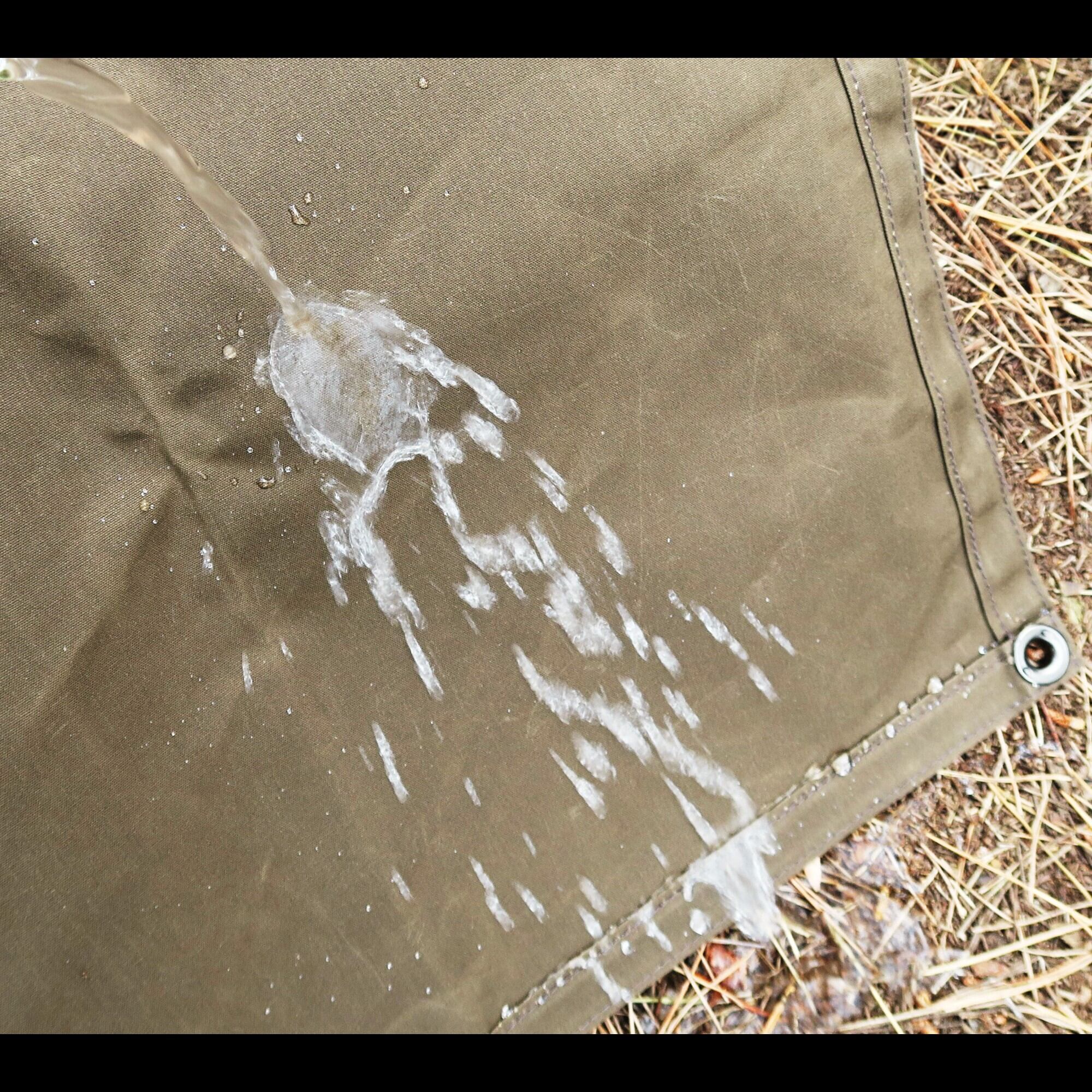 ⛺特長③軍幕調カラー&強撥水パラフィン加工 ●軍幕調ミリタリー色に染料染めした日本製上質帆布はチキューギ.案内人ゆうさんをイメージした、野営に馴染む色合いです。パラフィン浸け込み加工は、多くのパラフィンが生地内部、隙間にぎっしりと浸透します。滑らかで手触りが良く、撥水性が落ちない仕様は他には無い大きな特徴です(表面のみのロウ塗りですと、硬くパリパリでロウが取れやすいです)。上質帆布と日本の職人ならではの丹念かつ繊細なパラフィン加工が『地守』の基礎となっております。積雪面に耐える強撥水性、使うほど味が出る風合い性(ビンテージ感)を兼ね備えております。【手触りが良い生地感は、お子様も座ったり寝そべったりしやすいです。】